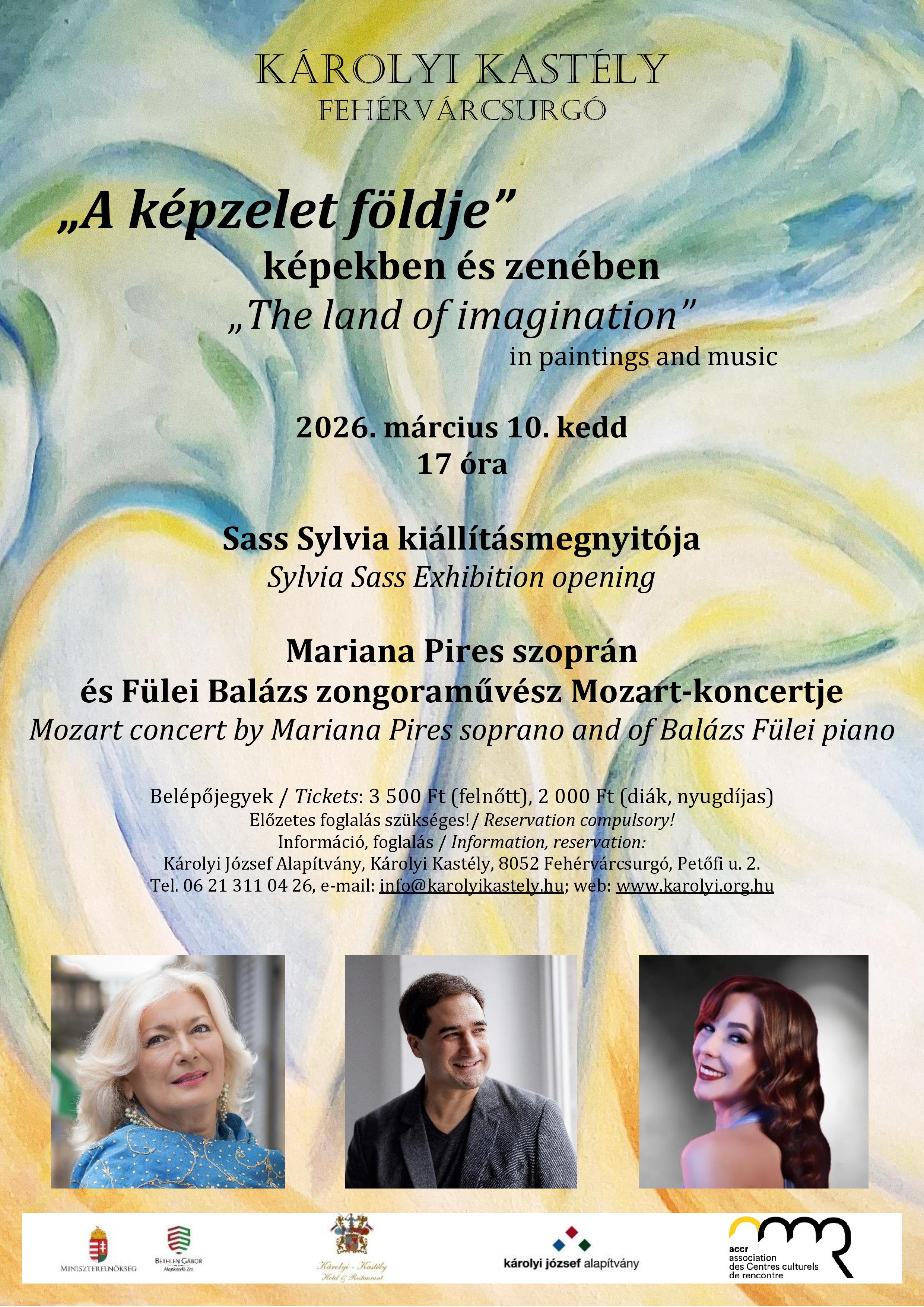 A nagyszerű szoprán, Sass Sylvia, aki egyben ismert festőművész is, március 10-én bemutatja műveit, valamint egy koncerten legtehetségesebb tanítványát, Mariana Pires szopránt egy Mozart-est keretében, Fülei Balázs zongoraművész, a Liszt Ferenc Zeneművészeti Egyetem Kamarazenei Tanszékének vezetője kíséretével.